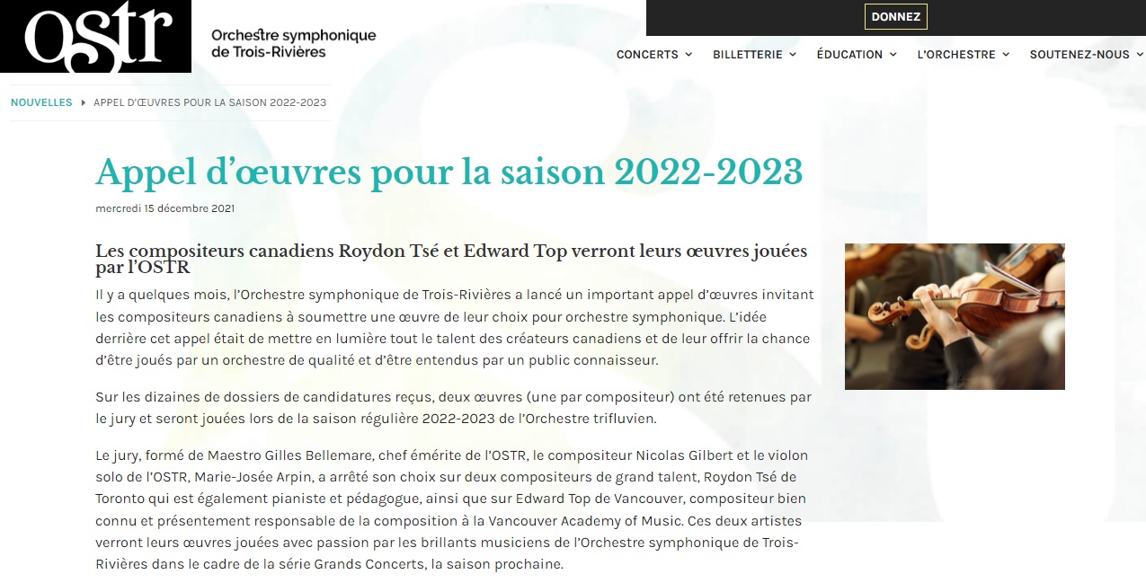 Dec 21 – Excited to announce that the Orchestre symphonique de Trois-Rivières in Quebec (CAN) has selected my piece “Toward Light” to be premiered in their 2022/23 season! The piece was selected from a call for scores from Canadian composers, led by Maestro Gilles Bellemare, composer Nicolas Gilbert, and violinist Marie-Josee Arpin.