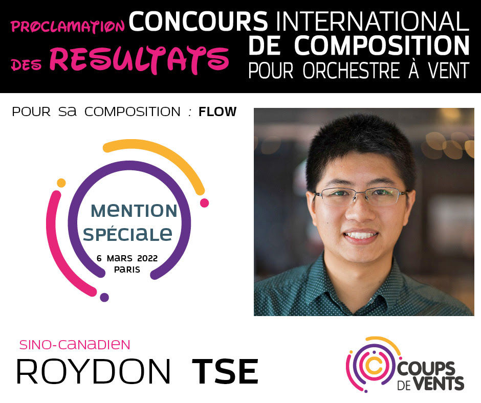 March 18 – I am excited to announce that my wind ensemble work “Flow” was awarded an honorable mention in the Coups de Vents International Composition Competition in Paris, France!