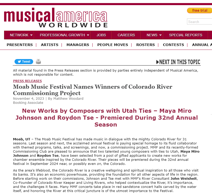 November 2023 – The innovative Moab Music Festival in Utah has commissioned a new work for chamber ensemble to be premiered in their 32nd season: