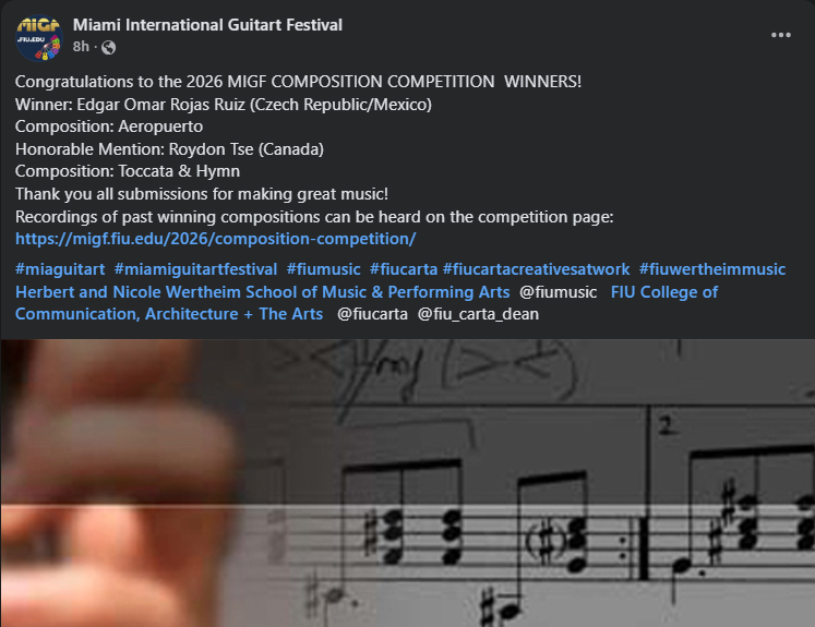 Feb 2026 – My guitar work “Toccata and Hymn” has received an honorable mention at the 2026 Miami International GuitART Festival Composition Competition. Congratulations to all!