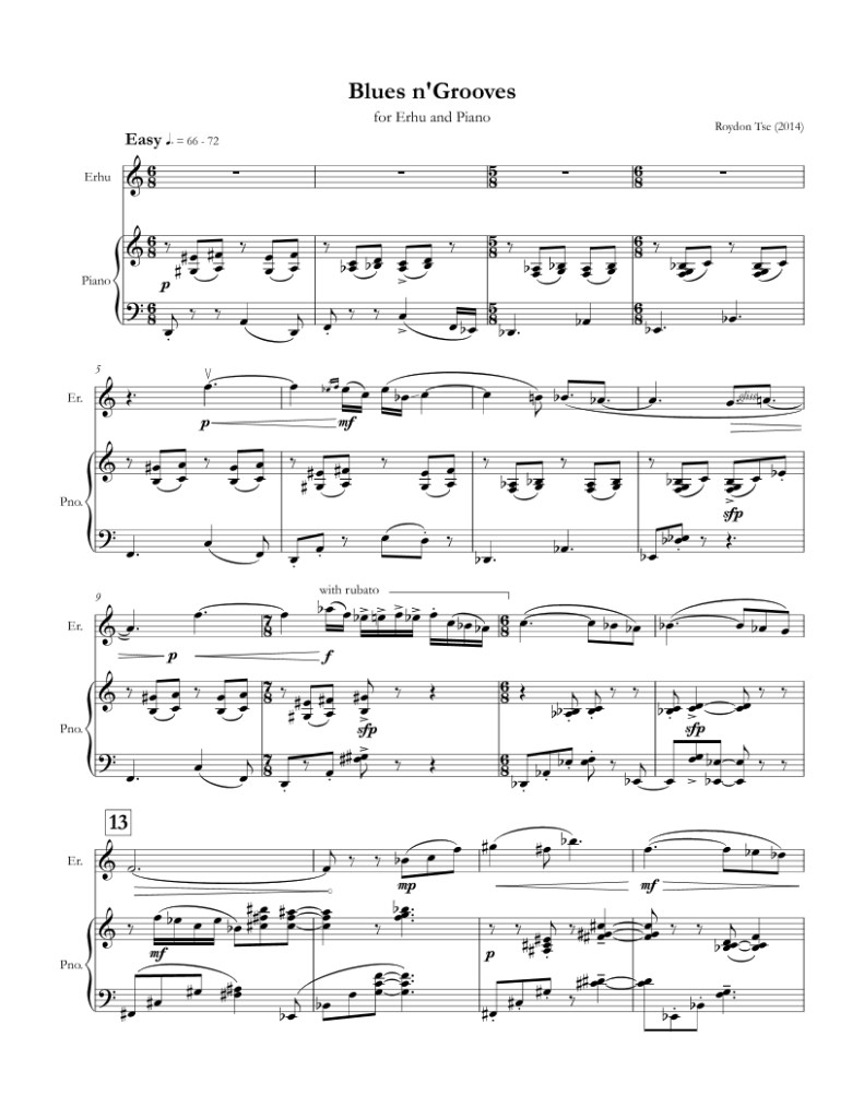 The piece itself is in a simple double binary form. Section A is a lyrical introduction, with the erhu singing a bluesy melody while the piano quietly accompanies. This transitions into the Vivace section, with syncopated rhythms and a driving pulse.
