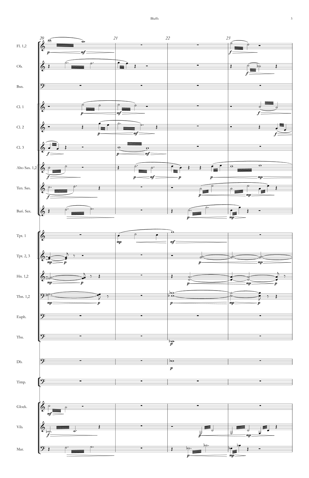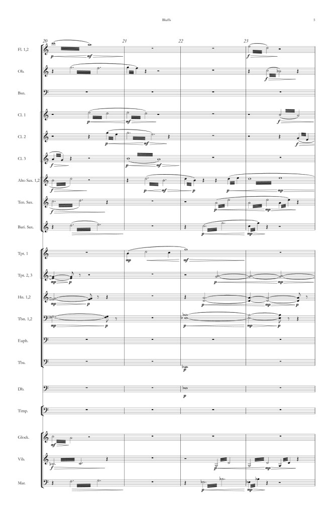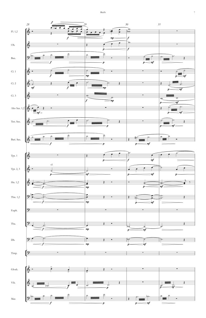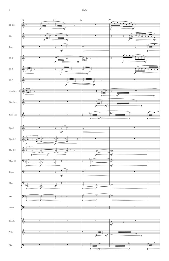 Mirroring the physical aspect of the Bluffs, the piece for intermediate-level concert band begins with quiet woodwinds evoking the undulation of water rippling on Lake Ontario that gradually culminates in a Sibelius-esque chorale for brass near the end of the piece representing the rising of the Bluffs.