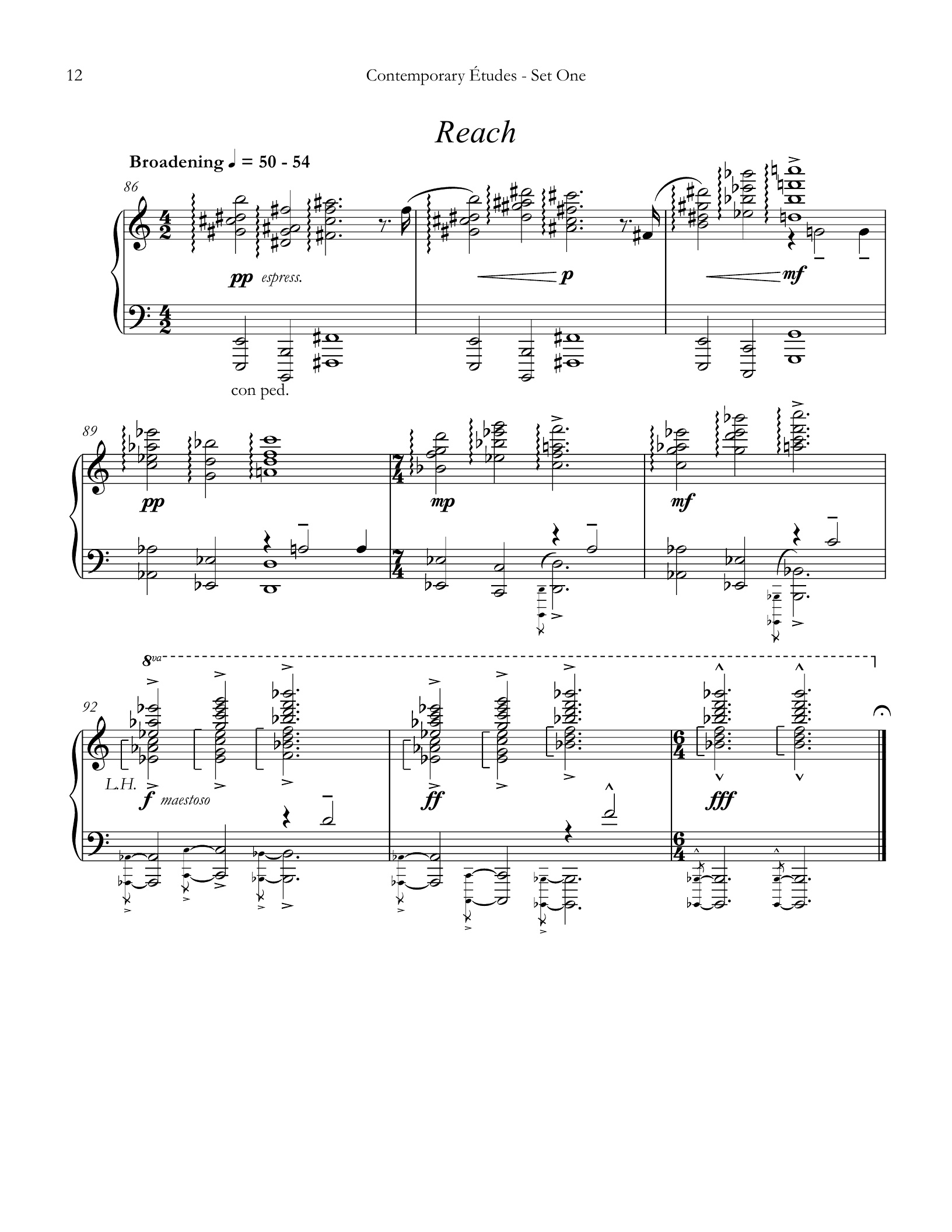 Reach is an exercise in wrist action which is required for many of the large chords in the right hand. The étude begins softly and ends the set with broad and bold chords.