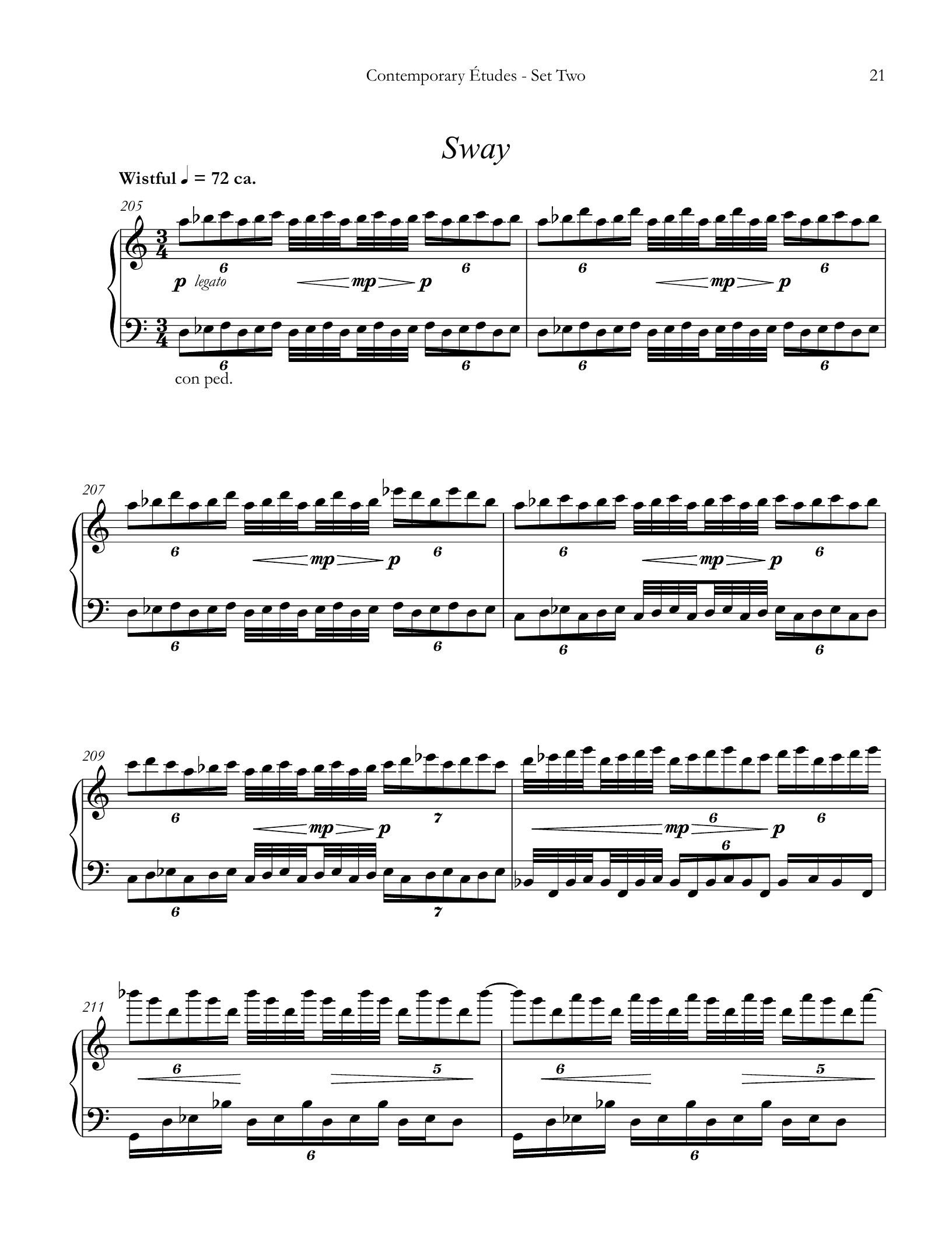 Sway explores the feathered beam notation for the keyboard and asks the performer to create a sense of ebb and flow in the music.