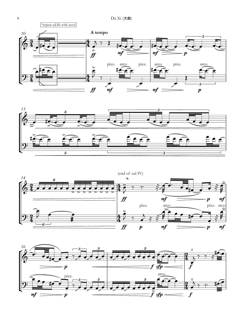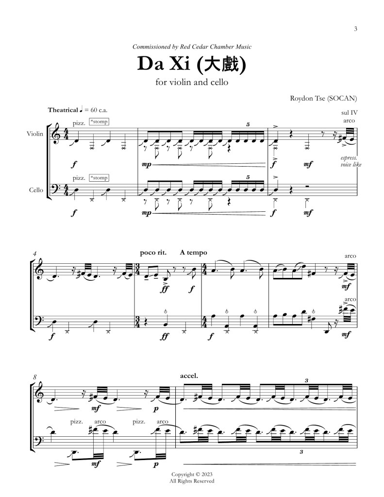 “Dà Xì” (大戲), translated literally as “large scale spectacle” is the Chinese term for opera. My piece explores the rich tropes and traditions found in art from through the lens of contemporary chamber music. Growing up in Hong Kong, I remember fondly many Cantonese Opera performances in local theatres featuring loud singing, percussive drumming, and colorful costumes. My piece is a playful reimagination of some tropes found in Cantonese 大戲 framed in two sections. It opens with a dramatic introduction in the de facto Cantonese style where repeated instrumental gestures speed up and build in momentum, ending with a gong or percussive hit. The second section (B) is a fast scherzo exploring the heterophonic texture found in the instrumental music of Cantonese Opera – one characterized by multiple variations of the same melodic line intertwined with one another – in a busy dialogue between the instruments. The word 大戲, akin to another Chinese term 遊戲 meaning “games,” sets the tone for the final section, where both instruments engage in playful imitation.