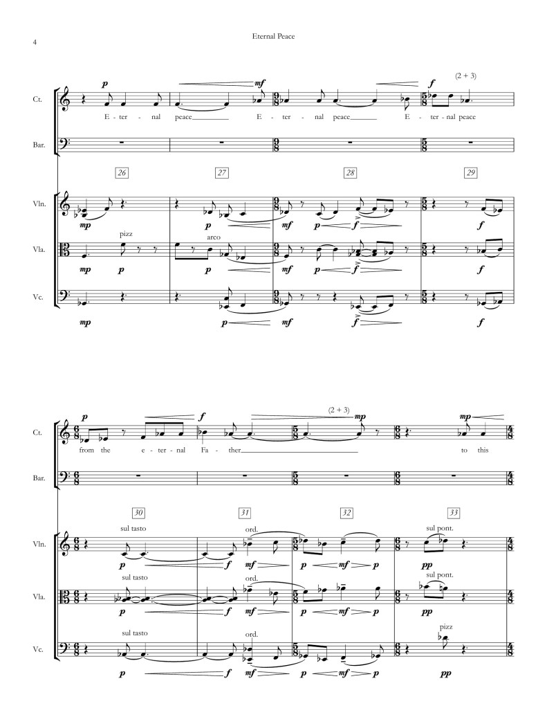 Written for the Gabriela Lena Frank Creative Academy of Music’s 2021-22 cycle, Eternal Peace is a meditation on peace for two singers and string trio. The words were inspired in part by the Gregorian chant “Pax Aeterna”. The piece begins with a series of chord progressions that stutter and repeat themselves, which represent a sense of unease that is set in contrast to the words “Eternal Peace”. The countertenor and baritone intone the titular words repeatedly over various musical backdrops. In this sense, the singers represent the unwavering peace that transcends the unpredictable ups and downs of the world.