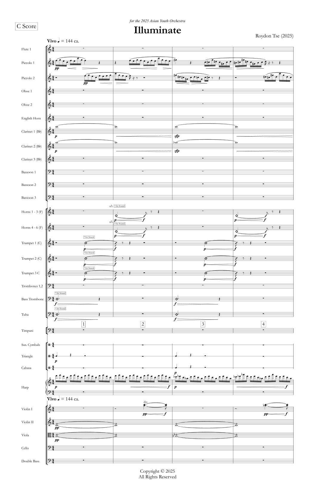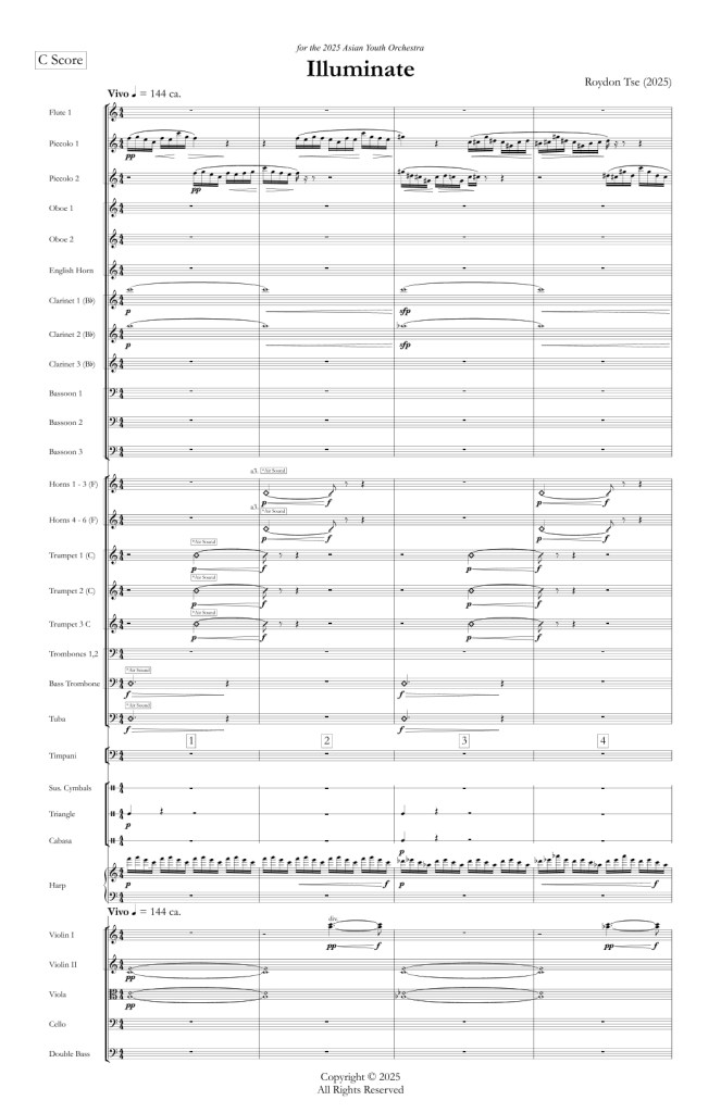 Illuminate, written for the 2025 Asian Youth Orchestra, captures the transformation of Hong Kong at dusk as the skyline bursts into a symphony of LED lights. Shimmering motifs and brass ostinati mirror the city’s energy and represent the brilliance of young musicians. Just as lights illuminate the night, this piece celebrates the power of youth to inspire and shape their future in spite of challenges in their path.