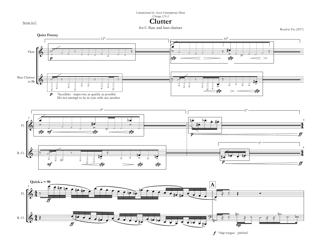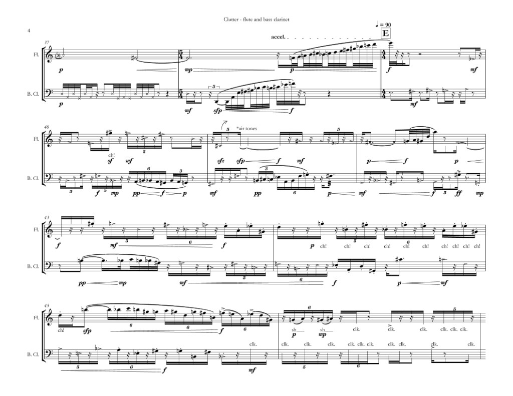 “Clutter” was inspired by the historic Sedgwick Studios in Chicago, sculptor’s studio which was formerly an electric substation. Within its long cavernous hall lies equipment and machinery that belongs to the many artistic inhabitants that call this studio their home and workshop. Set in this space, Clutter is a depiction of the imagined soundscape that artists and sculptors create as they work on their projects. I wanted to place the flute and bass clarinet directly into the soundscape of the workshop, and used several extended techniques to imitate sounds of shuffling, clanking, sanding of wood, and metal working, making the performers “as if one” with the studio personnel. Clutter is a piece that is situated within the unique acoustic space that is Sedgwick Studios and is a celebration of the joyous cacophony that is part of the artistic process.