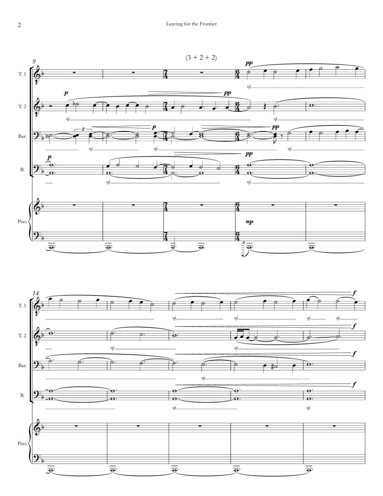 Commissioned by Erick Lichte and Chor Leoni for the C/4 Canadian Composers Competition, Leaving for the Frontier is a choral setting of the Chinese poem by the renowned Tang-dynasty poet Du Fu (712-770 AD). The poem – in the standard five-character-quatrain structure – is the first in a series of nine poems about soldiers going to the frontier to fight for the emperor. It expresses the sorrow and bitterness of soldiers who leave their families behind to fight and questions the seemingly insatiable desire of the emperor to expand his empire at all costs. Repeated syllables such as “qi”, “yi” and “fu” are used in a clever word play, emphasizing the feeling of anger that is prevalent.