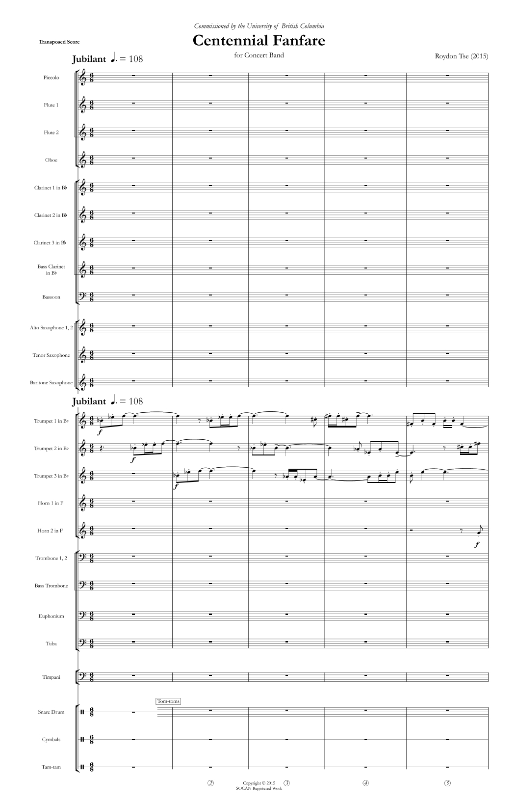 Commissioned by the University of British Columbia’s (UBC) 100th anniversary, this fanfare captures the energy, forward motion, and sense of excitement that is a signature of UBC as a world-class learning institution. While most fanfares are high energy throughout, I also feel that the 100th anniversary should also be an opportunity to reflect and meditate on the past century, which is the rationale for a quieter middle section featuring the chimes which ring 10 times, each representing a decade of the hundred years of UBC.