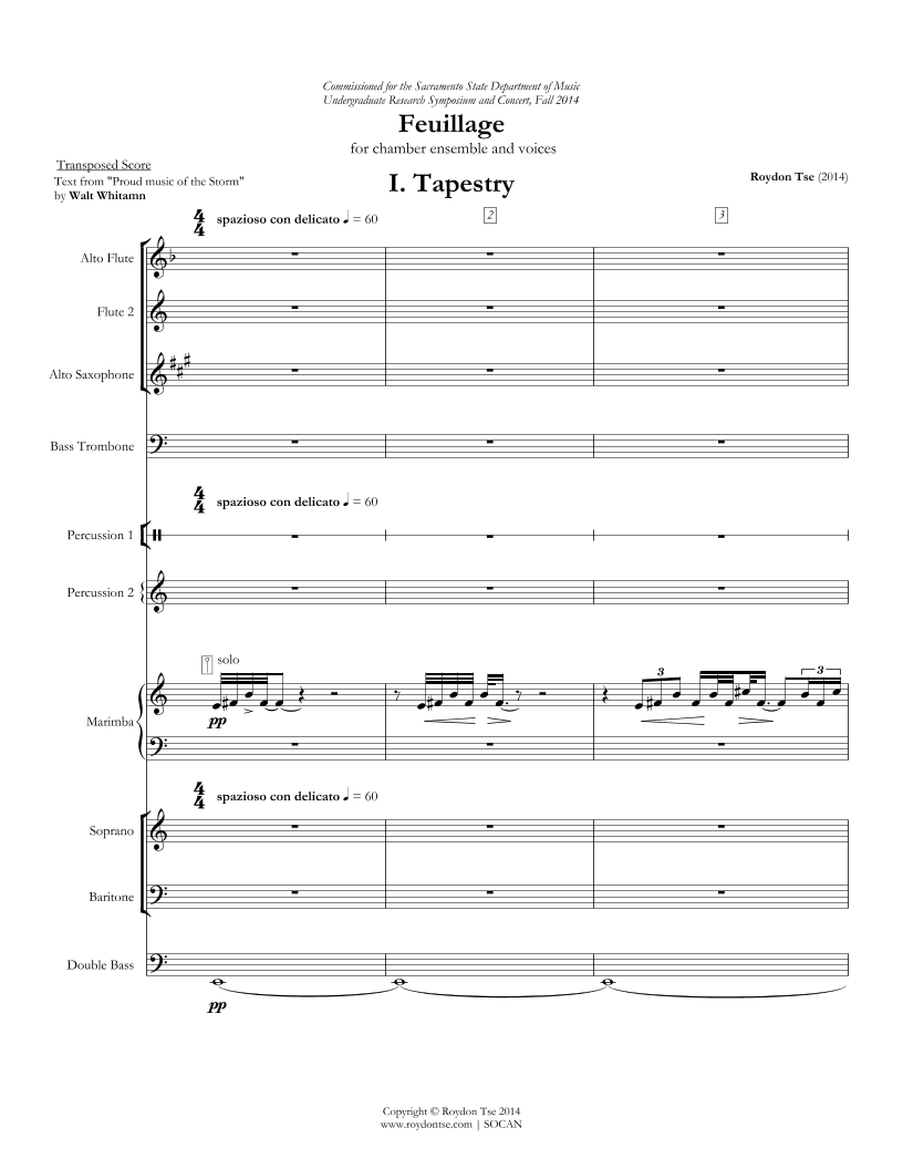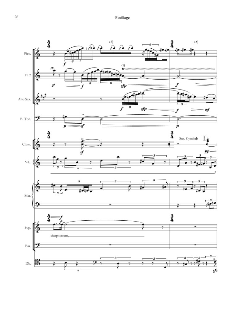 Feuillage is a triptych for mixed chamber ensemble that takes inspiration from nature. Written for the California State University Faculty of Music in Sacramento, the work is in three movements, with the second movement based on a snippet from Walt Whitman’s “Proud Music of the Storm” scored for soprano, baritone, and ensemble.
