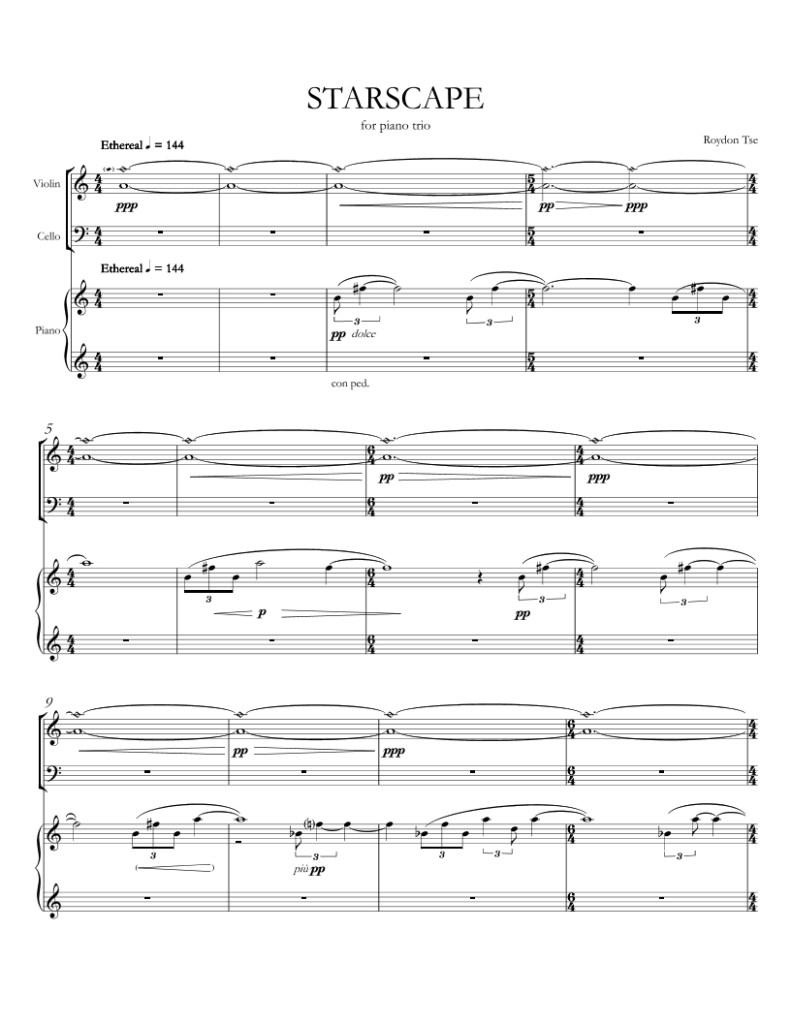 For Starscape, this piece is about the progression from light to darkness, from peace to chaos. I imagined myself looking out into the sky and taking in the stars. The stars begin to move closer and closer, until their blinding light reaches a climax before fading away into the distance.