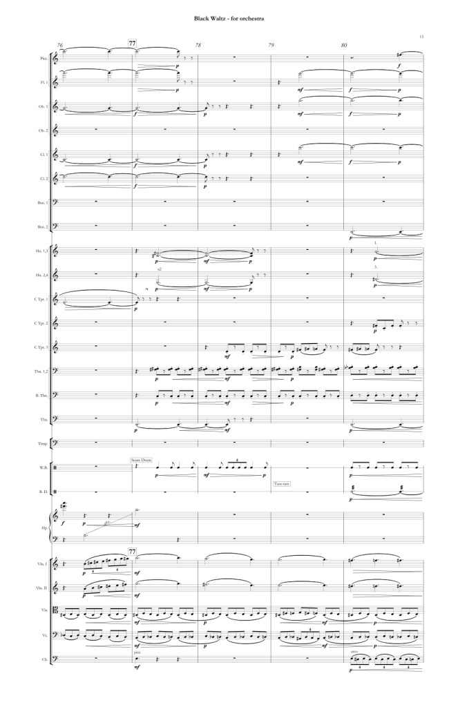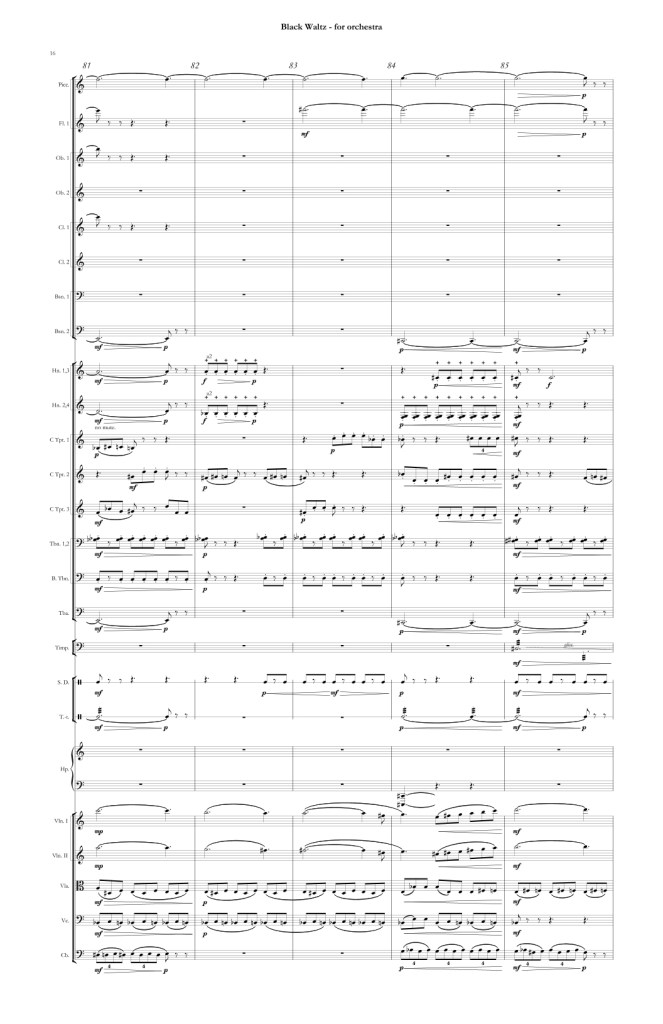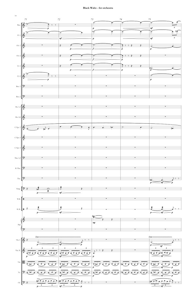 When thinking of what would work well in a reading session situation with the large forces of the NYOC, I decided to write something that would challenge the string section with something fast. The piece is set in two parts: the first, a twisting scherzo for the strings and the second, a soaring waltz melody that is assaulted by the forces the orchestra. In this, I attempted to conjure an atmosphere of unease and tension that would build up throughout the piece and be released at the very end.
