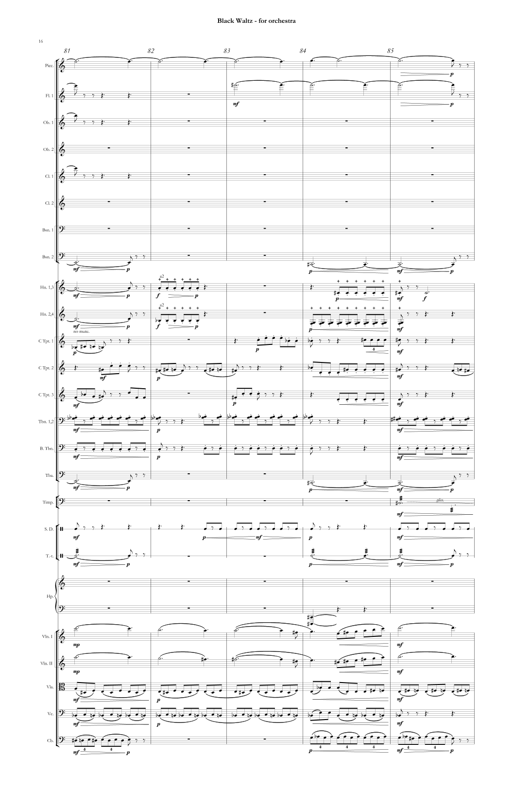 When thinking of what would work well in a reading session situation with the large forces of the NYOC, I decided to write something that would challenge the string section with something fast. The piece is set in two parts: the first, a twisting scherzo for the strings and the second, a soaring waltz melody that is assaulted by the forces the orchestra. In this, I attempted to conjure an atmosphere of unease and tension that would build up throughout the piece and be released at the very end.