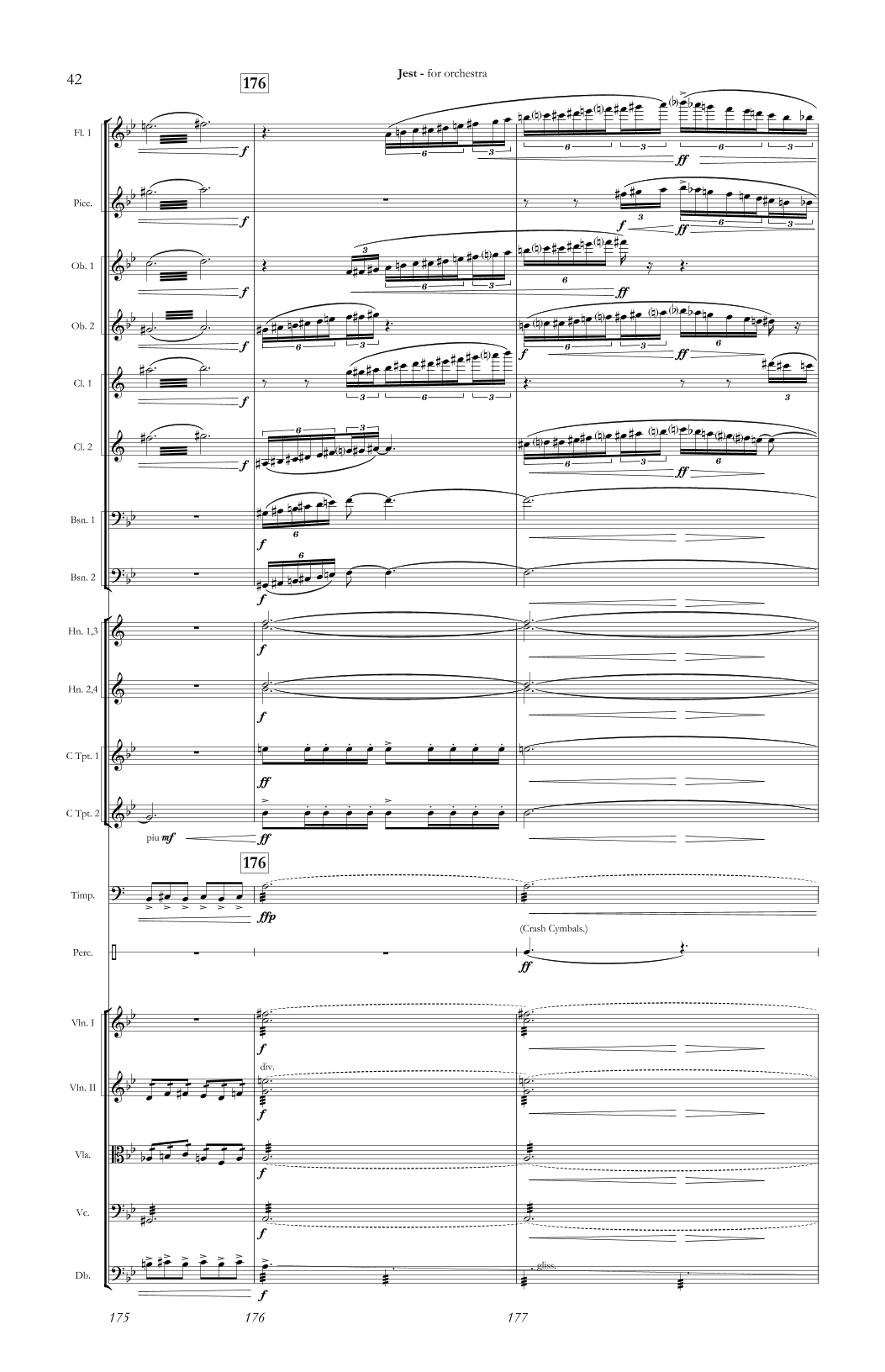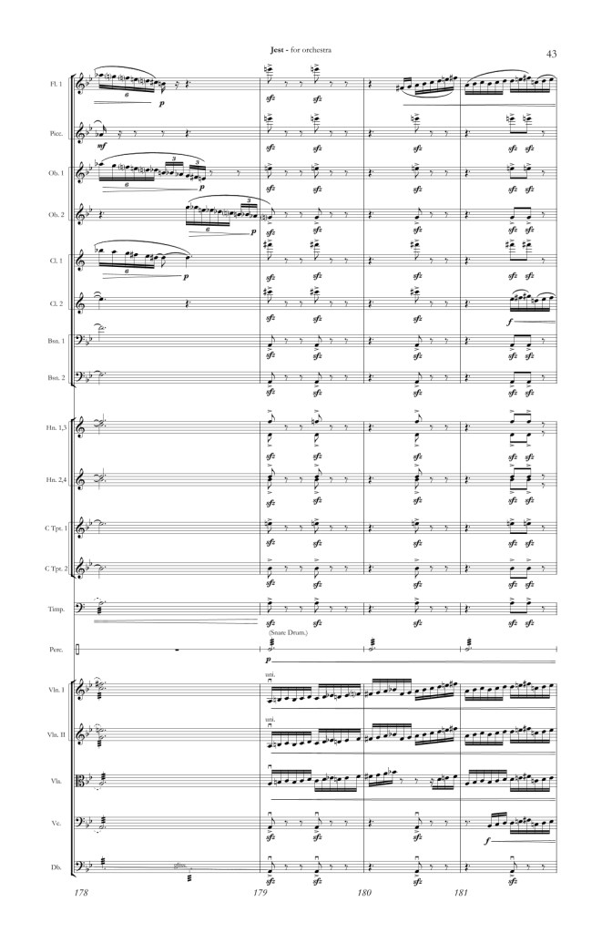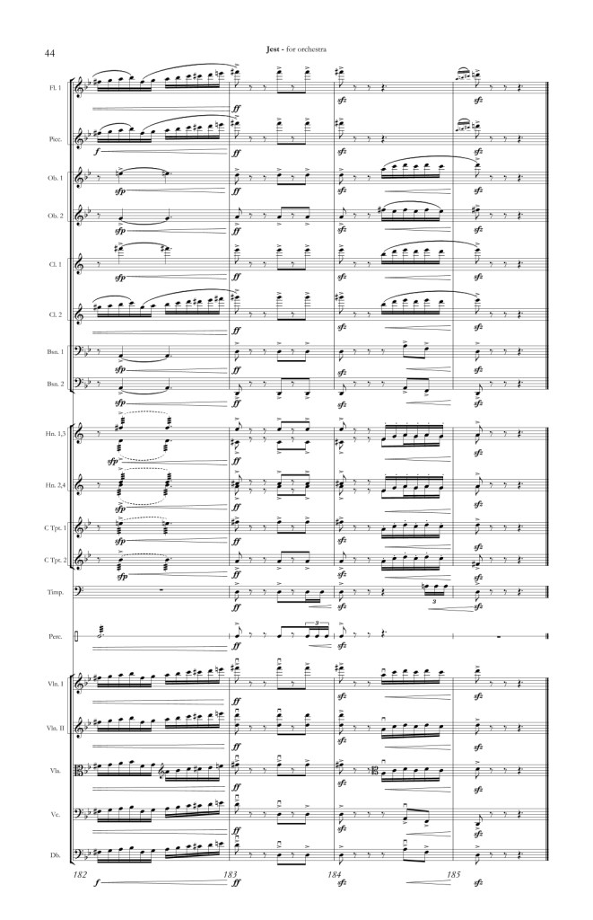 The title Jest is a play on the word “Gesture”, as a repeating four note gesture pops up throughout the work. This motive was the inspiration behind the piece, and was actually the activation ring tone on my cell phone for a couple of years. I decided to take this material and incorporate it into a fun work for orchestra.
