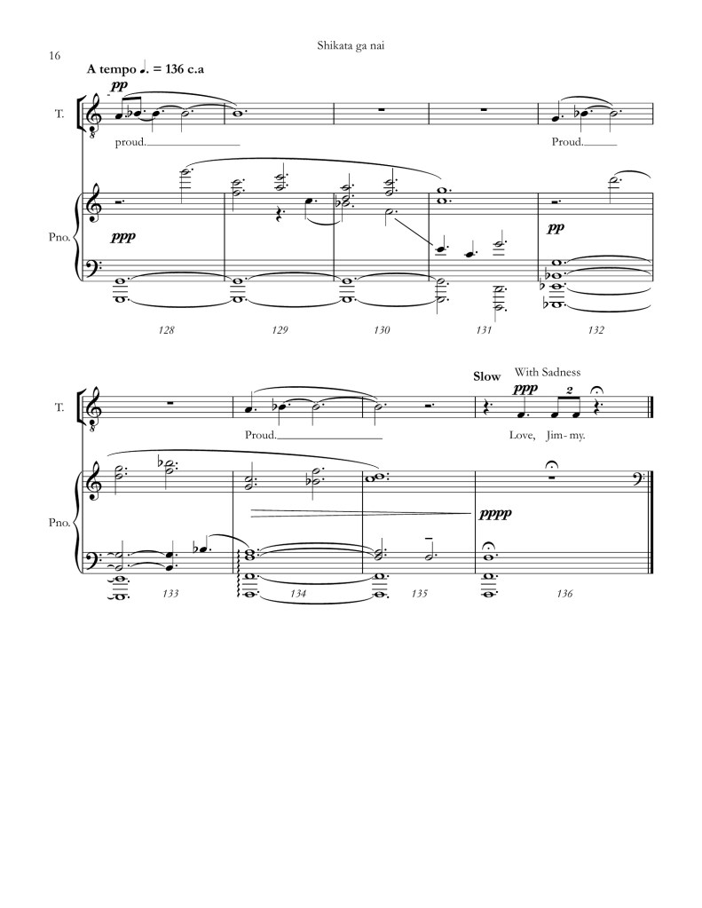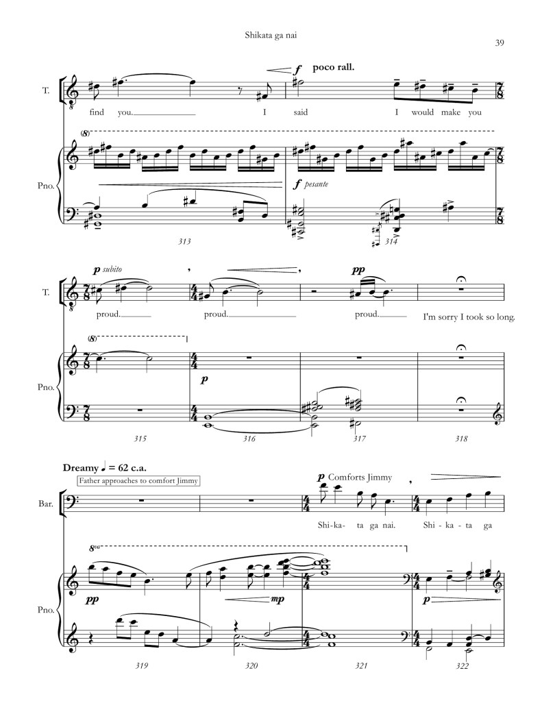 The opera tracks his journey from his early days in the tomato farm to his eventual reunification with his father in Hiroshima. Scene 1 begins by introducing the father and Jimmy, and focuses in on the words Shikata Ga Nai (Japanese for “It cannot be helped”.) From there, the opera takes the form of a series of letters from Jimmy to his father in which he recounts his entry into the internment camp (Scene 2), his training in Camp Blanding Florida (Scene 3), a death of a close friend and the dropping of the bomb on Hiroshima (Scene 4), and finally his return to Japan and finding his father alive (Scene 5).