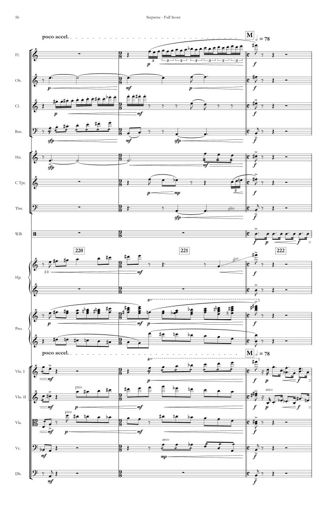 Stepwise (2023) is my second commission for the Esprit Orchestra and is my latest attempt at forging a distinct harmonic language moving forward. The piece is structured as a series of variations on a theme which begins after a short introduction which contains the essence of the harmonic motion to come. The theme which begins at m.10 comprise of angular leaps and jumps and constantly moves through tonal centers in a kaleidoscopic manner which attempts to eschew any sense of tonal resolution. Subtitles such as “Dreams”, “Hocket”, and “Ravvivando” communicates the concept behind some variations, while others are left to the performer’s imagination.