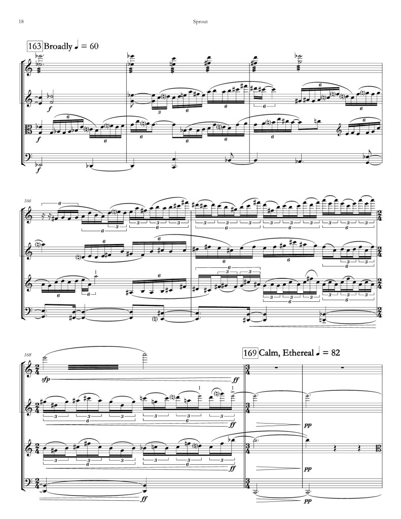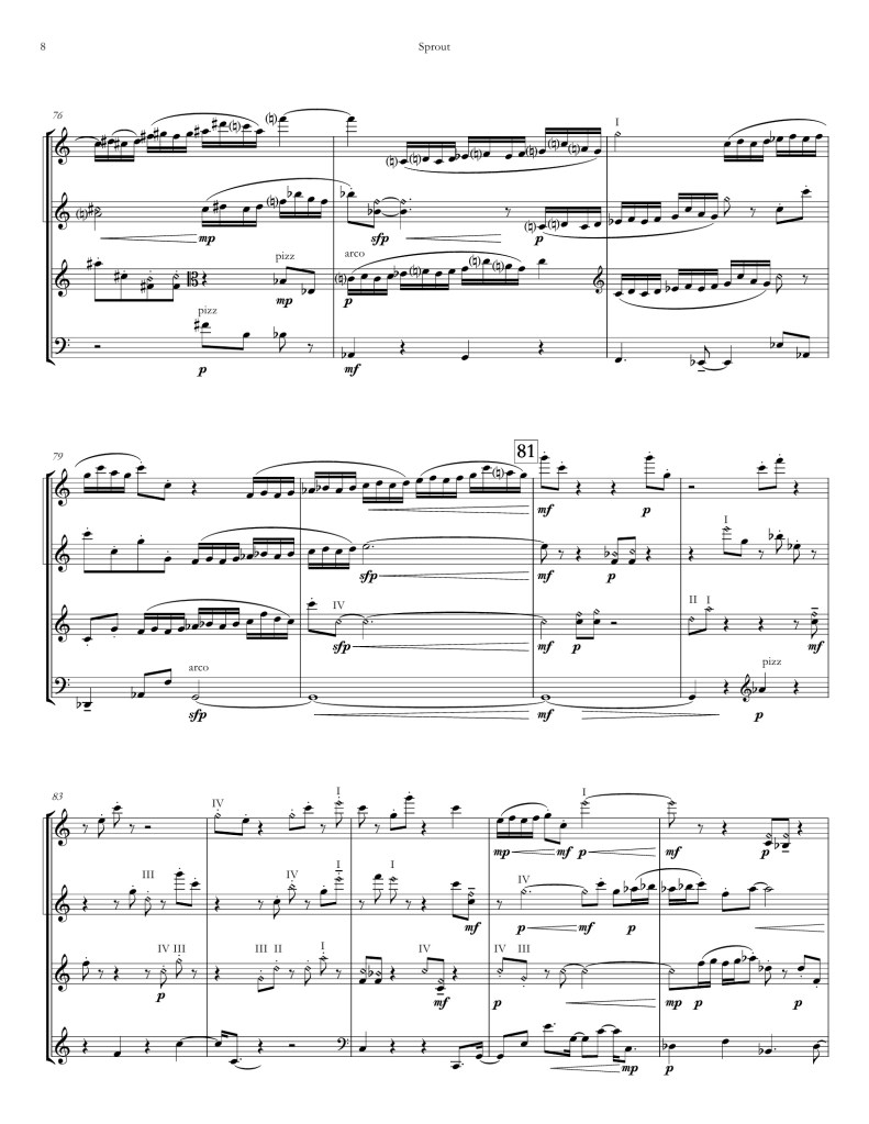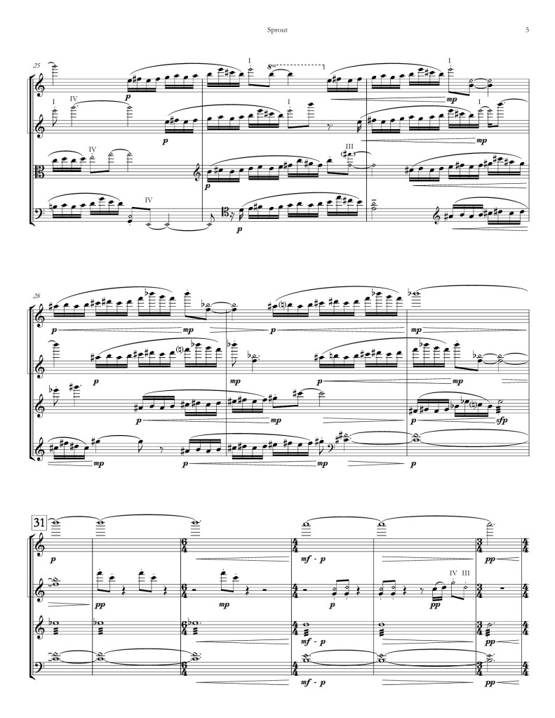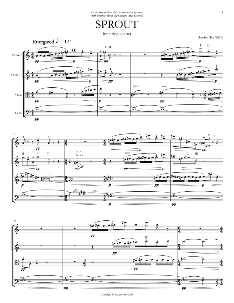 Commissioned by the Interro String Quartet with financial support from the Ontario Arts Council, ‘Sprout’ is an eight-minute work for string quartet inspired by images of nature. A particular image that stood out to me is one of a small green seedling bursting from the soil. The quartet is inspired by the feeling of optimism and vitality found in nature and uses imitation and natural harmonics to represent them. While there are many seedlings that emerge from the soil every minute, not all mature to become the plants they are destined to be if they do not overcome challenges posed by the environment around them. In contrast to the upbeat beginning, a slower and darker section represents the internal struggle against these challenges during seasons of growth.