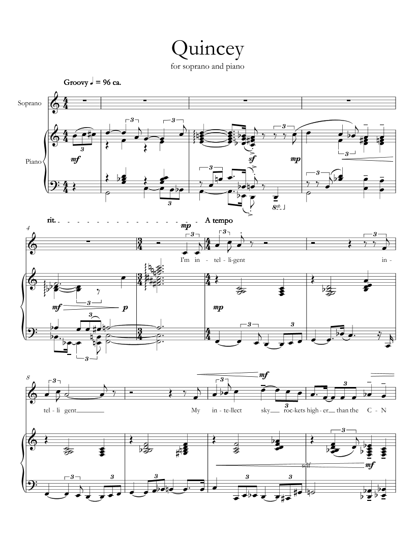 To wrap up the triptych, we have Quincey, a young man who claims he is intelligent, funny, and…unappreciated. The music illuminates this very interesting personality who exhibits dashing confidence as well as a desire to perform.