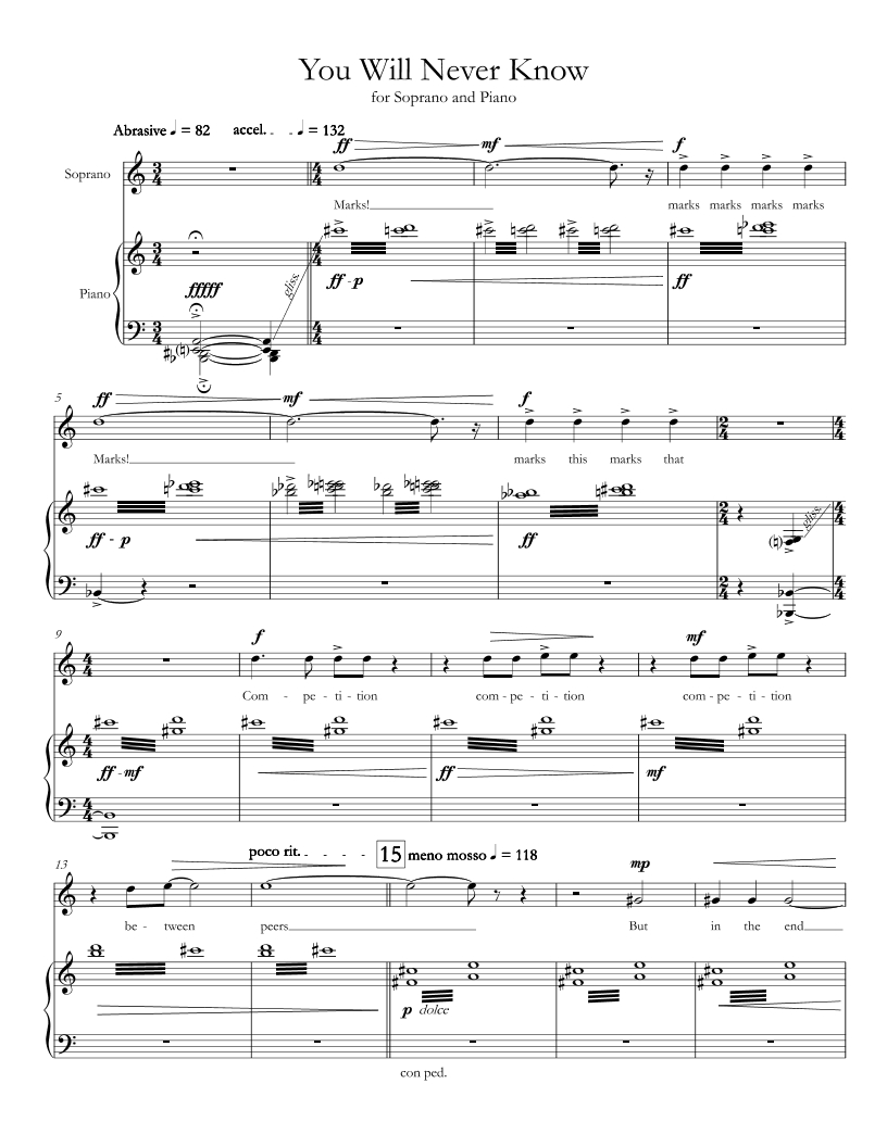 Commissioned by the Community Music Schools of Toronto (formerly Regent Park School of Music) for their Songbook project Vol.5, “Three Songs of Innocence” is a set of songs for high voice and piano setting the poetry of youth from Regent Park, Toronto. The text is fresh, uncompromising, and full of a naivete that only youth could have. In these texts, the budding writers express feelings from boundless wonder to the crushing sense of pessimism that are felt during exam seasons. Holding nothing back, the words come from a place of sincerity and honesty that truly enchants and serve as the perfect inspiration for a cycle of three songs.