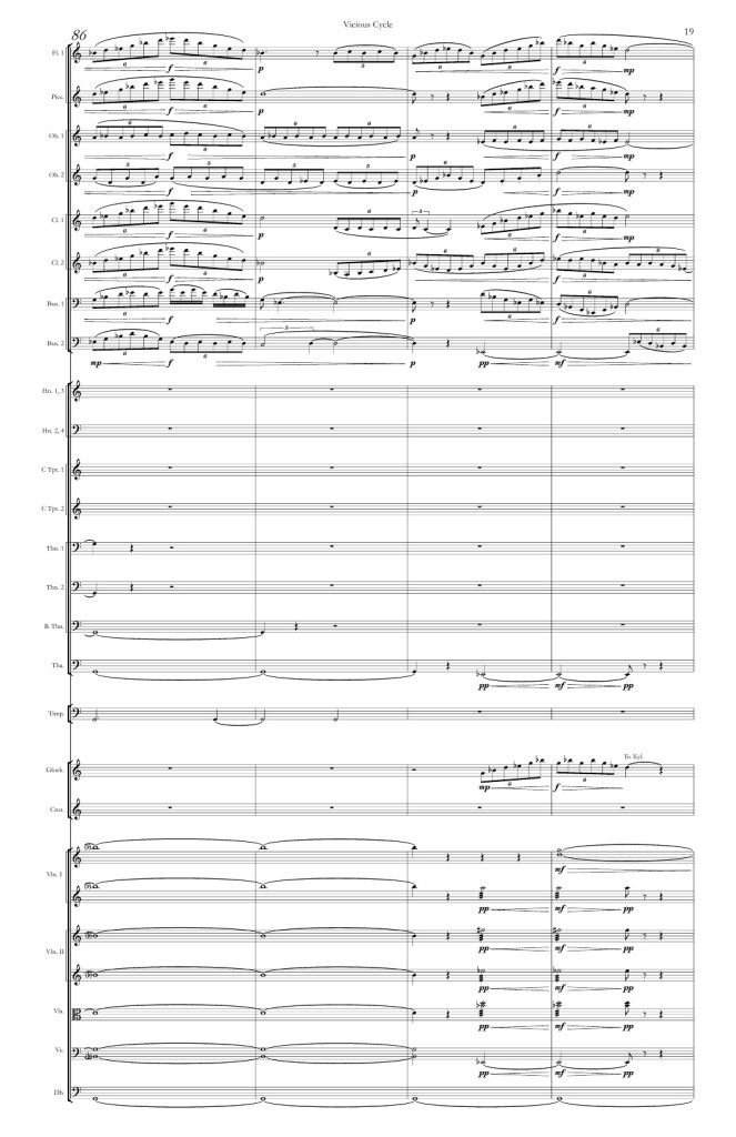 Vicious Cycle was inspired by the work and ethos of Beethoven. In the hubbub that was Beethoven’s 250th celebrations, the piece focuses on the sense of drama and wild contrast that Beethoven infused in his piece. The work begins with a tutti chord in C minor – reminiscent of the chords at the beginning of Eroica. Whereas the chords in Eroica give way to a bold theme in Eb major, the chords lead to a driving ostinato in the xylophone and strings which builds tension throughout.