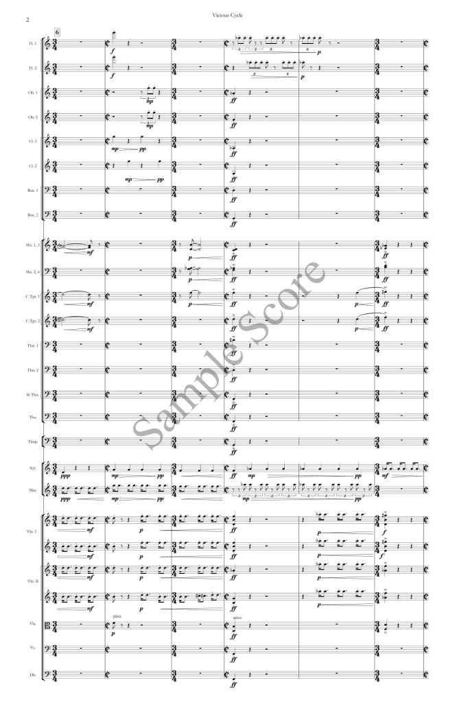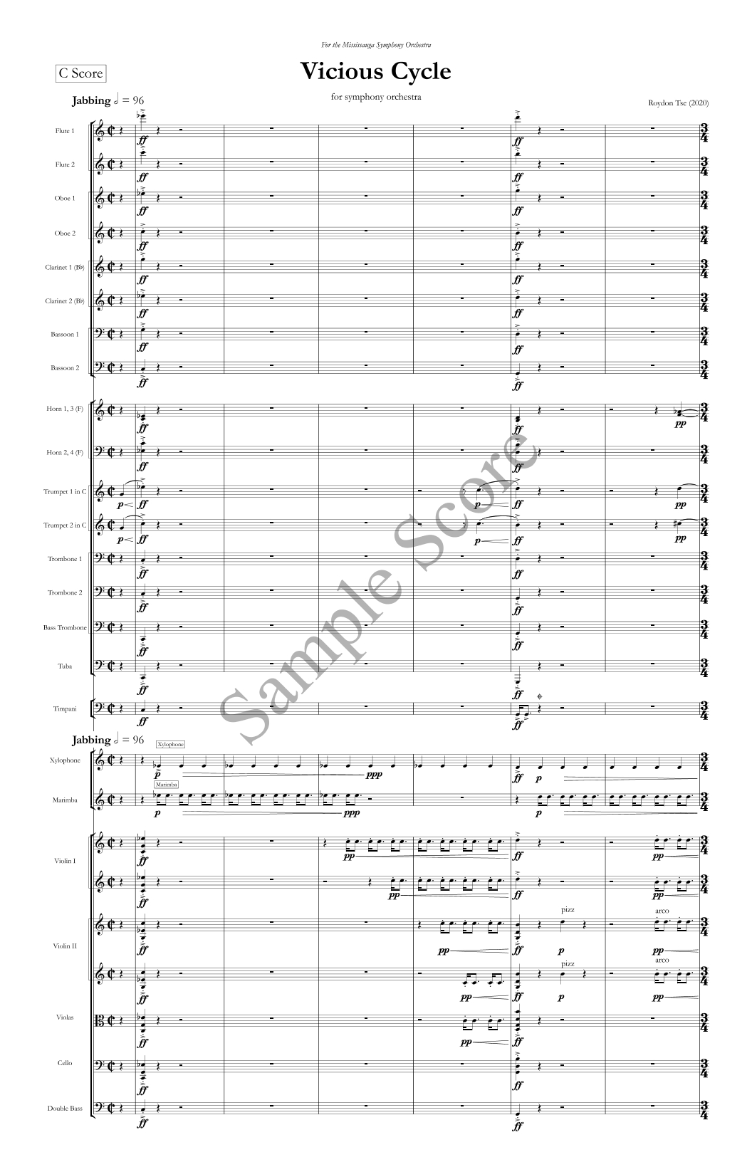 Vicious Cycle was inspired by the work and ethos of Beethoven. Composed within the hubbub that were Beethoven’s 250th celebrations, the piece focuses on the sense of drama and wild contrast that Beethoven infused in his piece. The work begins with a tutti chord in C minor – reminiscent of the chords at the beginning of Eroica. Whereas the chords in Eroica give way to a bold theme in Eb major, the chords lead to a driving ostinato in the xylophone and strings which builds tension throughout.
