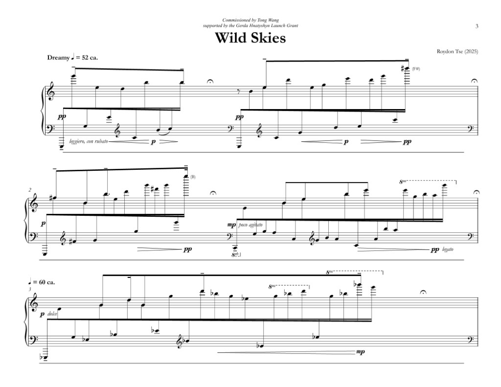 Wild Skies is a tribute to the boundless horizon and shifting clouds that stretch over the Canadian Prairies. Pianist Tong Wang and I share a deep connection to this landscape: both of us spent formative years in Alberta, and though our paths later took us elsewhere, the Prairies has continued to call us back. When Tong invited me to write this piece, the prospect of drawing inspiration from our shared environment made complete sense.
