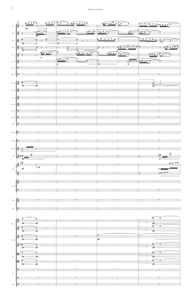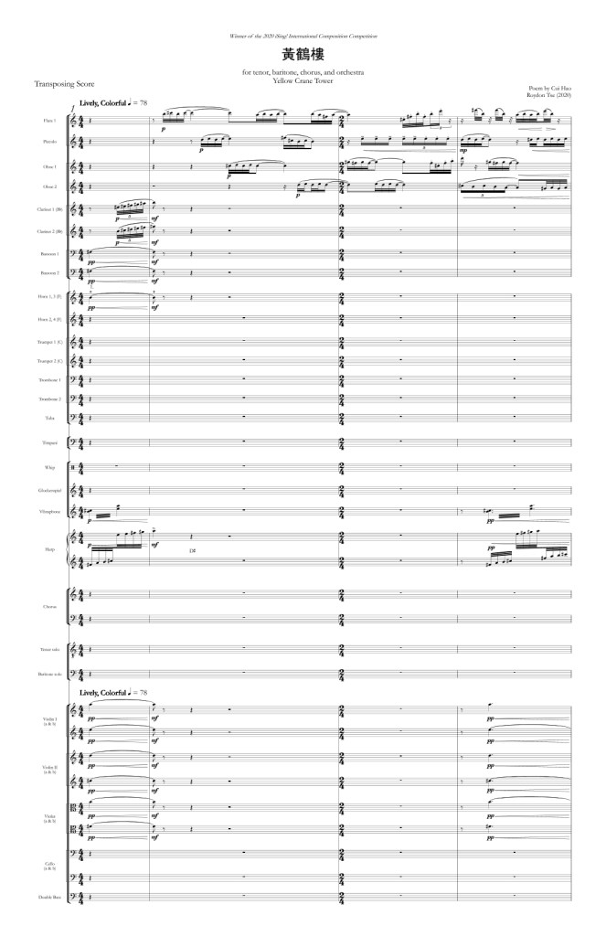 Yellow Crane Tower is an 8th century AD Tang Dynasty poem by Cui Hao, and is based on the iconic tower of the same name in Wuhan, China. The poem’s powerful effect comes from the use of imagery from the natural world to illustrate the poet’s melancholy. Words such as the “clouds wandering for a thousand years”, to the “Hanyang Tree” and “Misty River” conjure scenes from a romantic idyll. The tenor and baritone deliver the lines of the poet while the chorus reiterates and supports the soloists, adding another layer of sound to the orchestra.